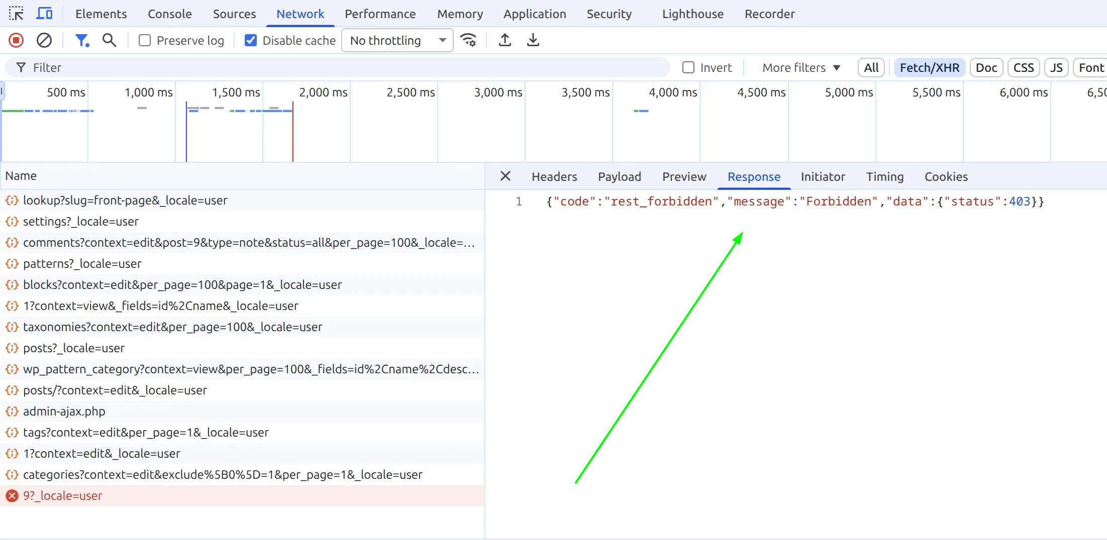 • Look for a failed request in red (usually admin-ajax.php or a /wp-json/ URL) returning a 403 status.
