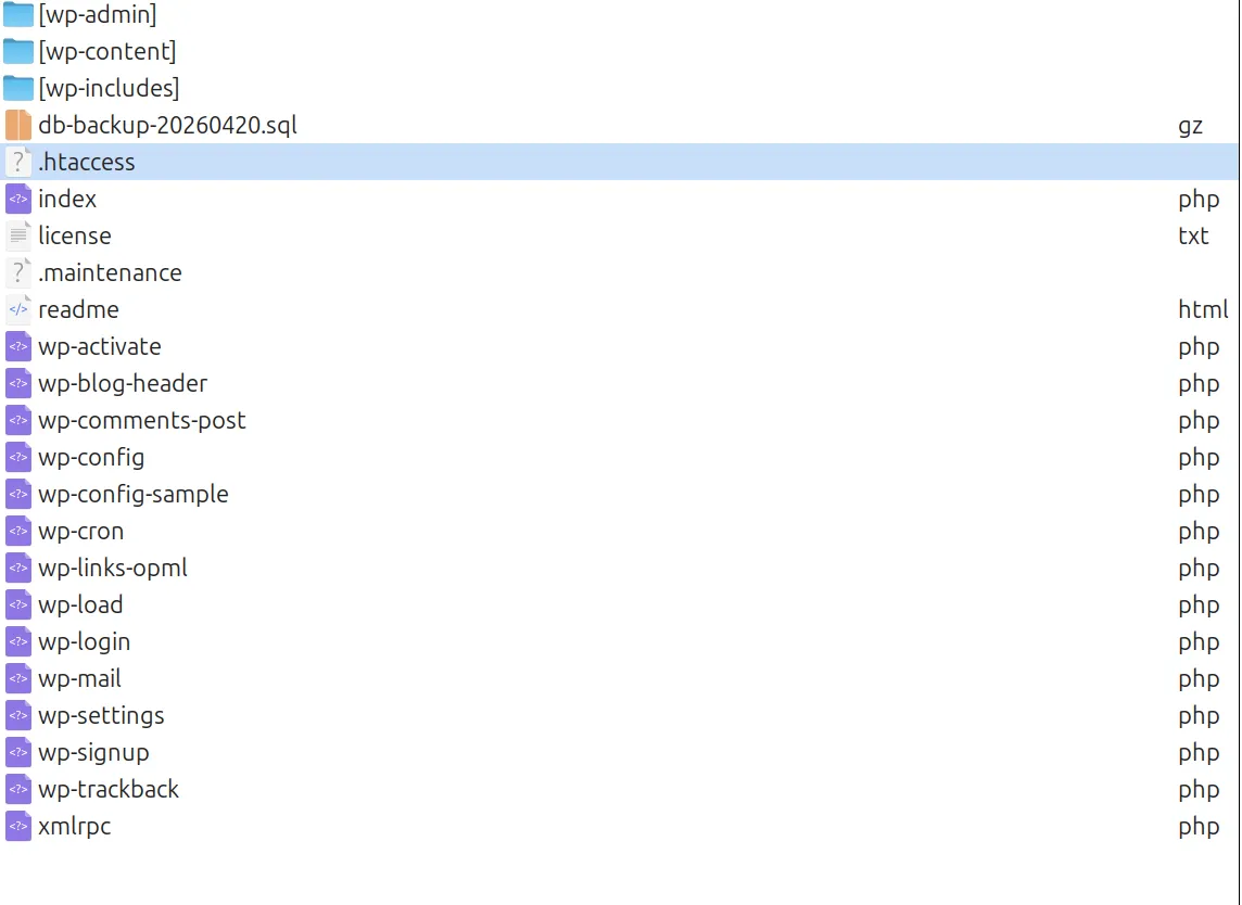 You’ll need to access it through your host’s File Manager or an FTP client. Open the File Manager in your hosting control panel (cPanel, Plesk, or your host’s custom dashboard), navigate to your site’s root folder (usually public_html or www), and look for a file called .htaccess. If you don’t see it, enable “Show hidden files” in the File Manager settings.