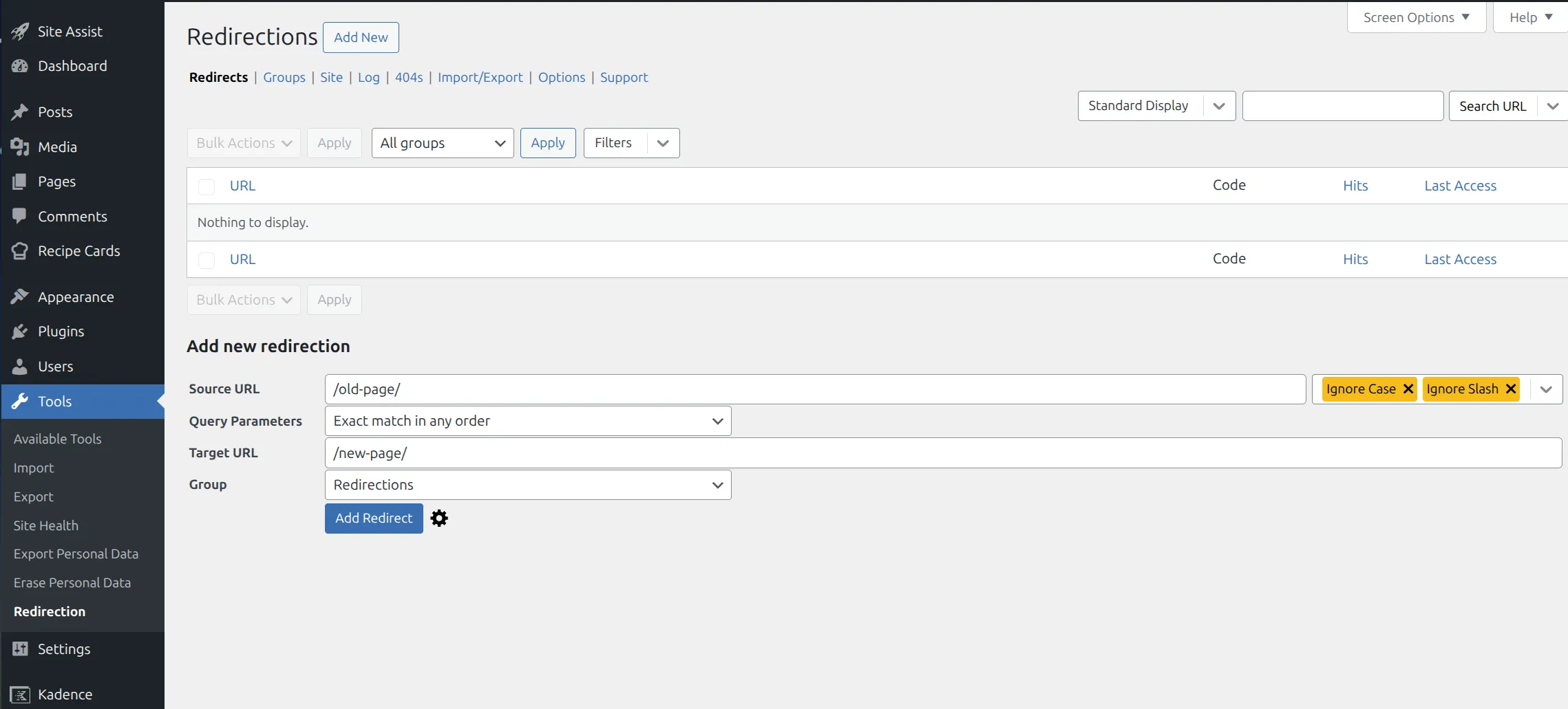 The free Redirection plugin handles this in 30 seconds. Install it, go to Tools > Redirection, enter the old URL in the Source field and the new URL in the Target field, and click Add Redirect. Visitors (and search engines) following the old link will bounce to the new one automatically. If you’re already using an SEO plugin like Rank Math or Yoast, they include redirect managers too – no need to stack a third plugin.