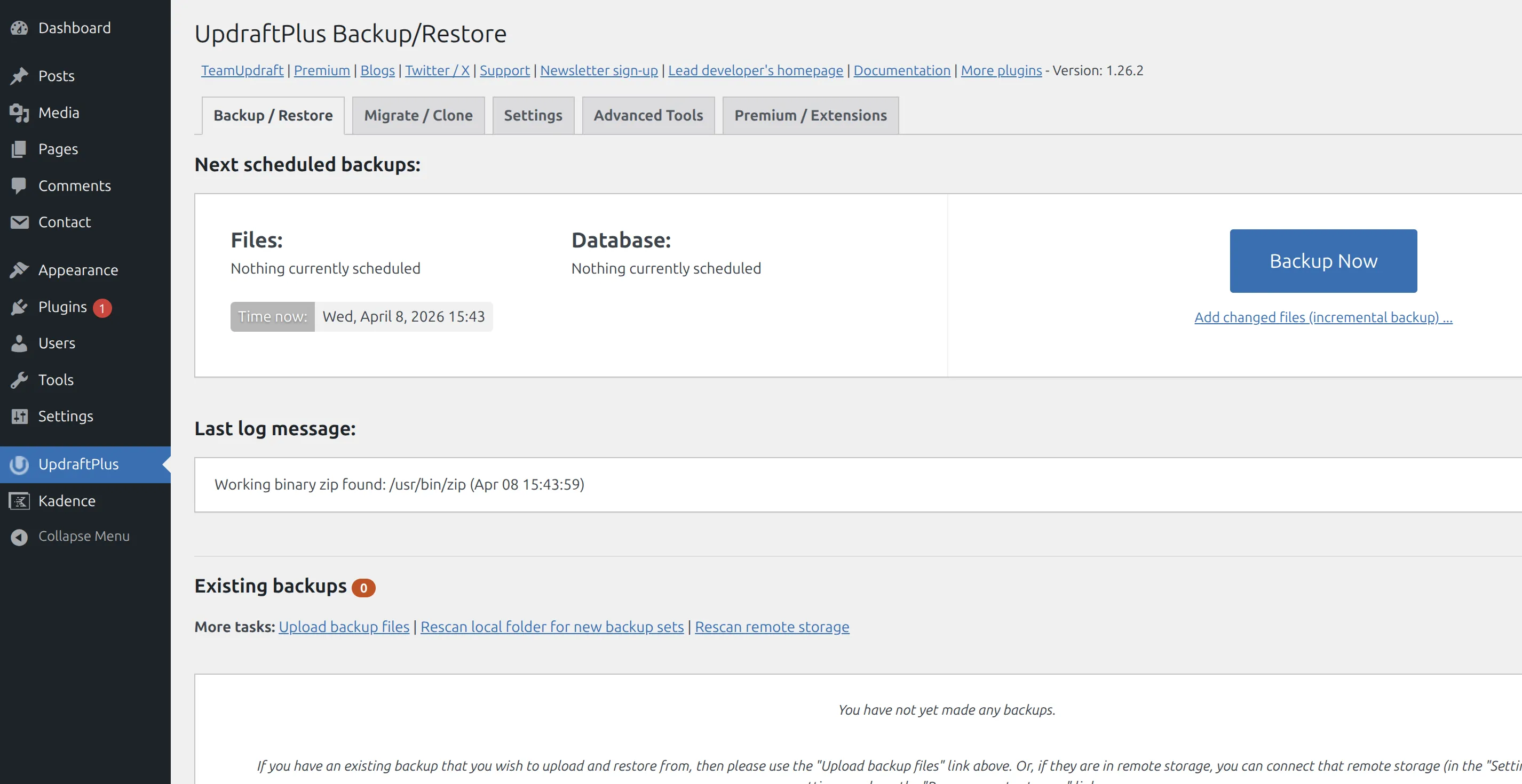 1. Make a backup – Open UpdraftPlus, click Backup Now, wait for it to complete (2 minutes)