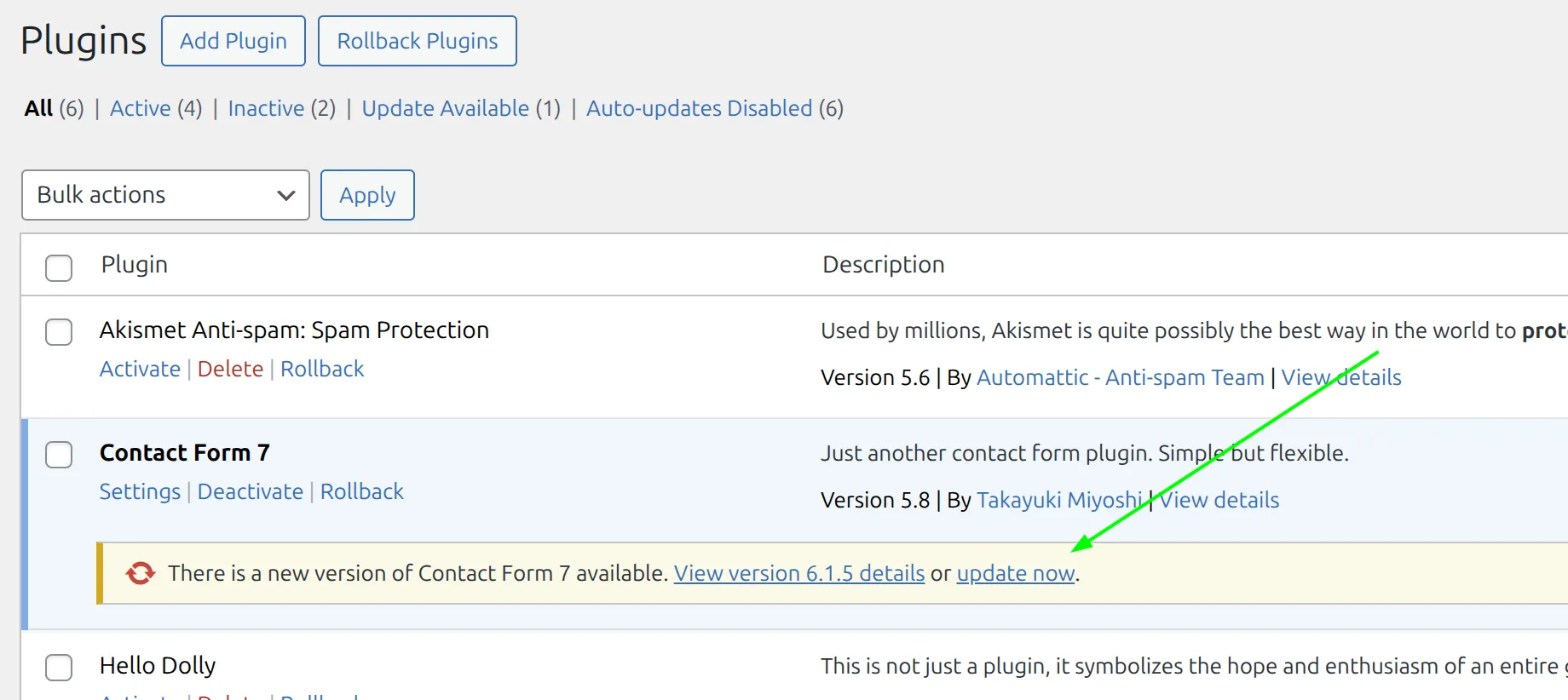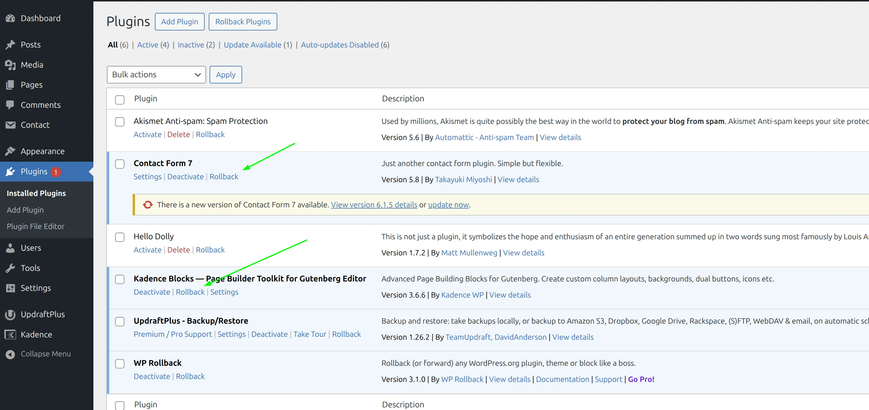 6. If something breaks: Click Rollback on that plugin (or restore your backup if the issue is severe)
