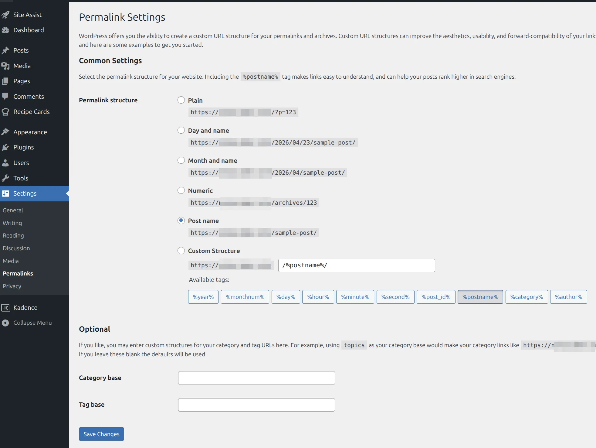 WordPress Settings Permalinks page with Post name structure selected and Save Changes button highlighted, used to flush rewrite rules when blog posts are not showing up