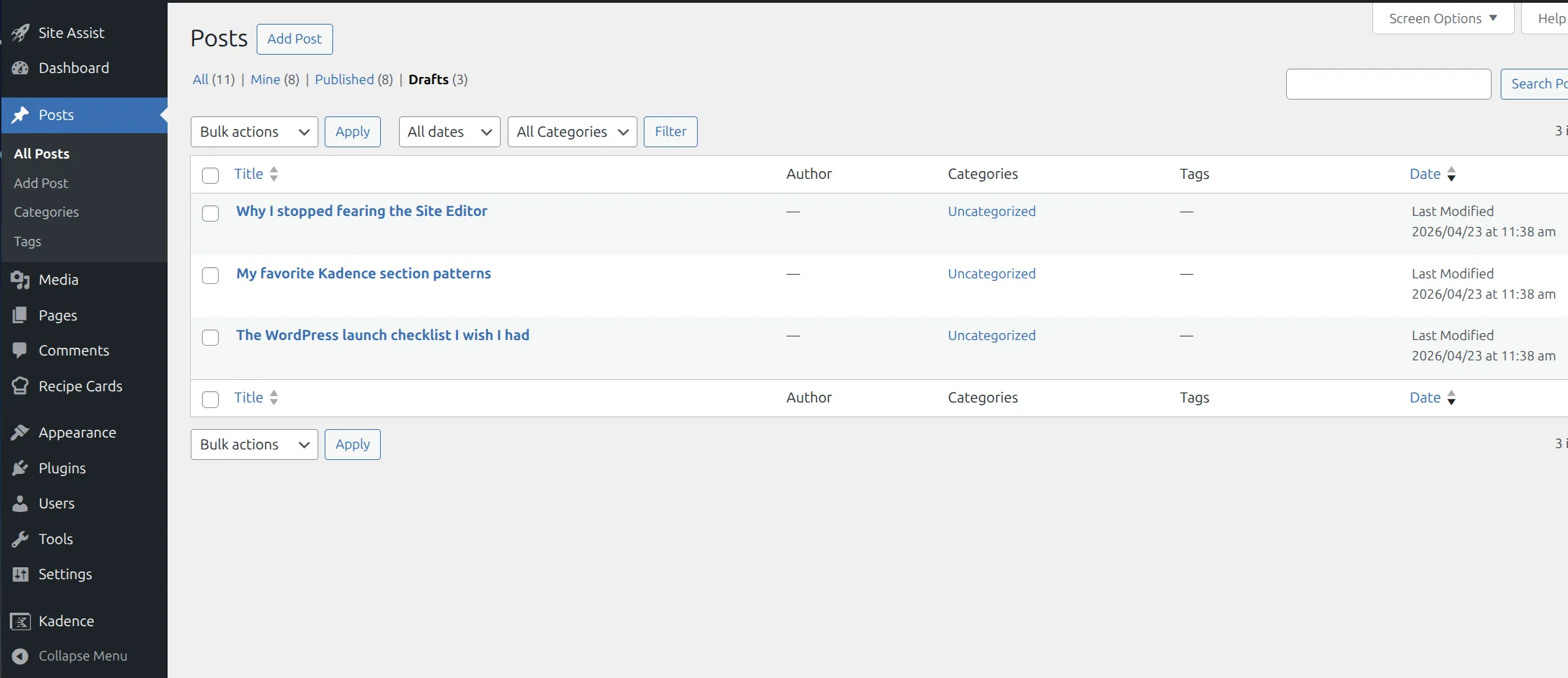 If you see posts in Draft, they’re not public yet. Hover over the title, click Quick Edit, change the Status dropdown from “Draft” to “Published,” and click Update. Or open the post in the editor and click the big blue Publish button in the top right.