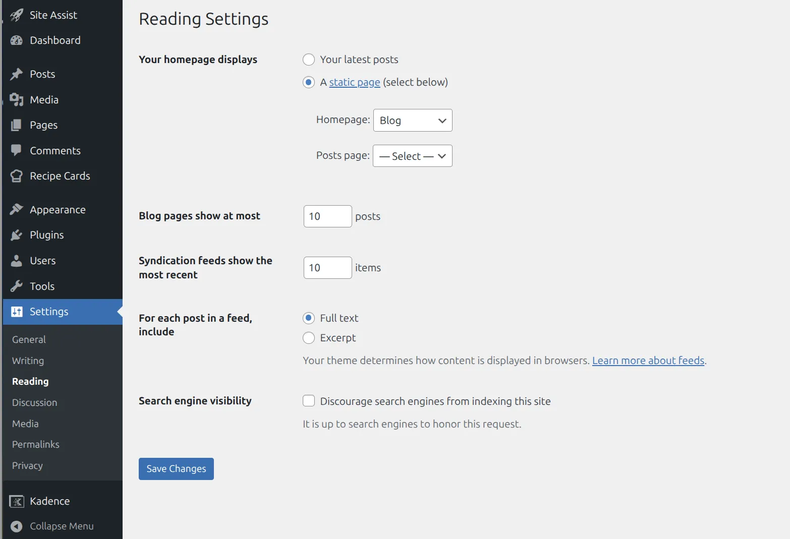 1. A static homepage is set, but no posts page is assigned in Settings > Reading